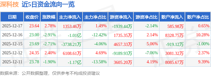证券之星消息,截至2025年12月17日收盘,深科技(000021)报收于23.64元,上涨2.78%,换手率2.48%,成交量39.01万手,成交额9.07亿元。