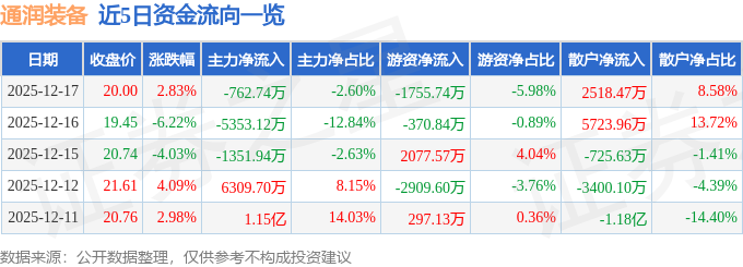 证券之星消息,截至2025年12月17日收盘,通润装备(002150)报收于20.0元,上涨2.83%,换手率4.16%,成交量14.92万手,成交额2.94亿元。
