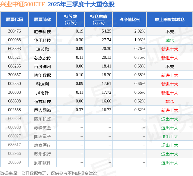 兴业中证500ETF基金成立于2020年6月30日,基金经理为张诗悦 徐成城,基金跟踪标的为中证500指数,成立以来超额回报为-11.42%,近一个月超额回报为0.37%。最新披露的基金持仓数据显示,截止2025年9月30日,该基金第一大重仓股为胜宏科技(300476),持股占比为2.02%。