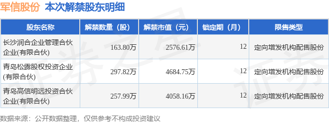 证券之星消息,根据市场公开信息整理,军信股份(301109)于12月18日将有719.61万股限售股份解禁,为公司定向增发机构配售股份,占公司总股本0.91%。(本次数据根据历史公告整理得出,实际情况以上市公司最新公告为准)最近一年内,该股累计解禁8487.88万股,占总股本的10.76%。本次解禁后,公司还有5.58亿股限售股份,占总股本70.77%。具体如下图所示: