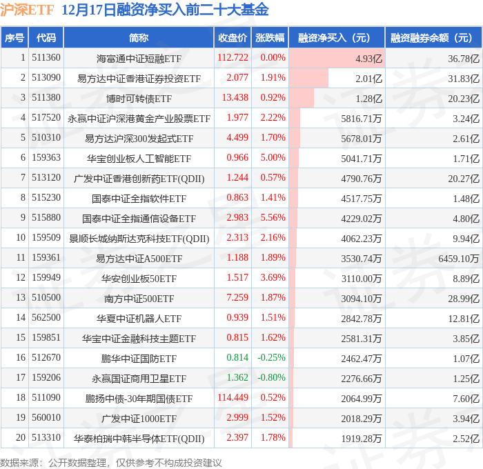 沪深ETF融资净买入前三分别为:海富通中证短融ETF(511360)融资净买入4.93亿元、易方达中证香港证券投资ETF(513090)融资净买入2.01亿元、博时可转债ETF(511380)融资净买入1.28亿元,前20具体见下表: