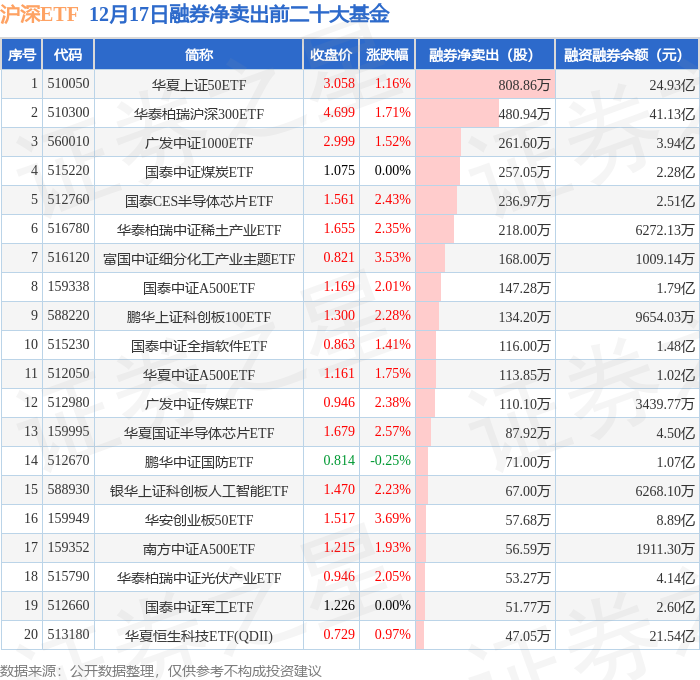 沪深ETF融券净卖出前三分别为:华夏上证50ETF(510050)融券净卖出808.86万股、华泰柏瑞沪深300ETF(510300)融券净卖出480.94万股、广发中证1000ETF(560010)融券净卖出261.6万股,前20具体见下表: