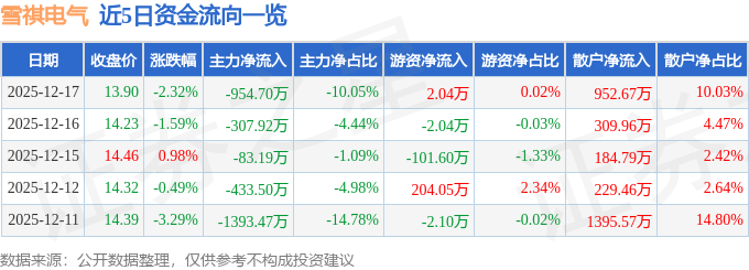 证券之星消息,截至2025年12月17日收盘,雪祺电气(001387)报收于13.9元,下跌2.32%,换手率6.02%,成交量6.86万手,成交额9495.49万元。