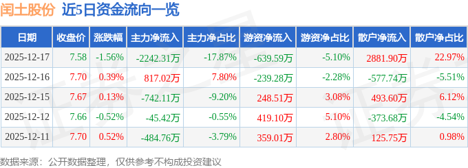 证券之星消息,截至2025年12月17日收盘,闰土股份(002440)报收于7.58元,下跌1.56%,换手率1.75%,成交量16.6万手,成交额1.25亿元。