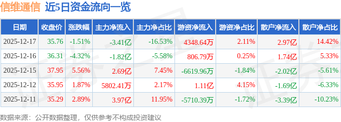 证券之星消息,截至2025年12月17日收盘,信维通信(300136)报收于35.76元,下跌1.51%,换手率7.01%,成交量57.82万手,成交额20.61亿元。