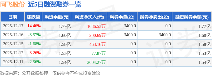 同飞股份融资融券信息显示,融资方面,当日融资买入7474.01万元,融资偿还5787.49万元,融资净买入1686.53万元,连续3日净买入累计2350.38万元。融券方面,融券卖出0.0股,融券偿还0.0股,融券余量3400.0股,融券余额27.66万元。融资融券余额1.77亿元。