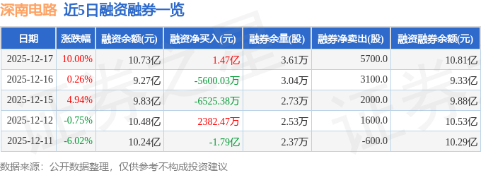 深南电路融资融券信息显示,融资方面,当日融资买入3.95亿元,融资偿还2.49亿元,融资净买入1.47亿元,净买入额两市排名第13。融券方面,融券卖出8100.0股,融券偿还2400.0股,融券余量3.61万股,融券余额802.89万元。融资融券余额10.81亿元。