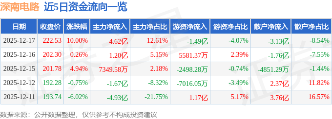 证券之星消息,截至2025年12月17日收盘,深南电路(002916)报收于222.53元,上涨10.0%,涨停,换手率2.6%,成交量17.28万手,成交额36.63亿元。