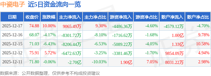 证券之星消息,截至2025年12月17日收盘,中瓷电子(003031)报收于74.88元,上涨10.0%,涨停,换手率3.99%,成交量13.56万手,成交额9.75亿元。