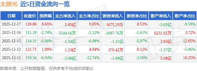 证券之星消息,截至2025年12月17日收盘,太辰光(300570)报收于120.8元,上涨8.65%,换手率14.06%,成交量27.02万手,成交额31.53亿元。