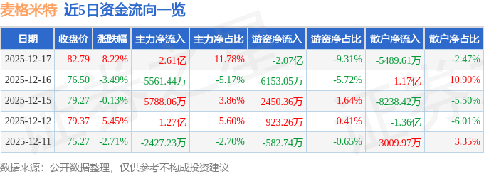 证券之星消息,截至2025年12月17日收盘,麦格米特(002851)报收于82.79元,上涨8.22%,换手率6.02%,成交量27.58万手,成交额22.2亿元。