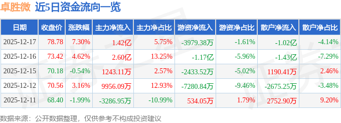 12月17日的资金流向数据方面,主力资金净流入1.42亿元,占总成交额5.75%,游资资金净流出3979.38万元,占总成交额1.61%,散户资金净流出1.02亿元,占总成交额4.14%。
