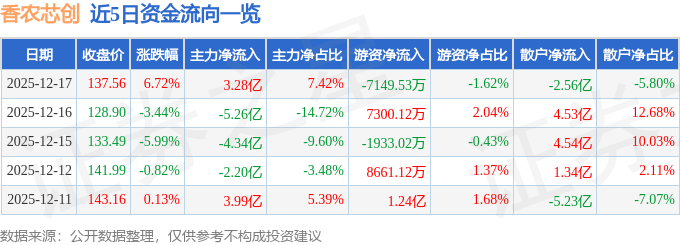 12月17日的资金流向数据方面,主力资金净流入3.28亿元,占总成交额7.42%,游资资金净流出7149.53万元,占总成交额1.62%,散户资金净流出2.56亿元,占总成交额5.8%。