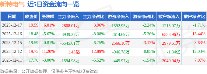 证券之星消息,截至2025年12月17日收盘,新特电气(301120)报收于19.59元,上涨6.01%,换手率17.16%,成交量37.52万手,成交额7.1亿元。