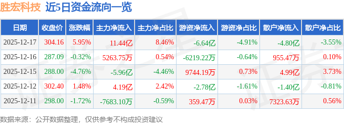 证券之星消息,截至2025年12月17日收盘,胜宏科技(300476)报收于304.16元,上涨5.95%,换手率5.34%,成交量45.66万手,成交额135.31亿元。