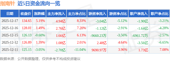 证券之星消息,截至2025年12月17日收盘,指南针(300803)报收于134.65元,上涨5.19%,换手率7.51%,成交量44.93万手,成交额59.32亿元。