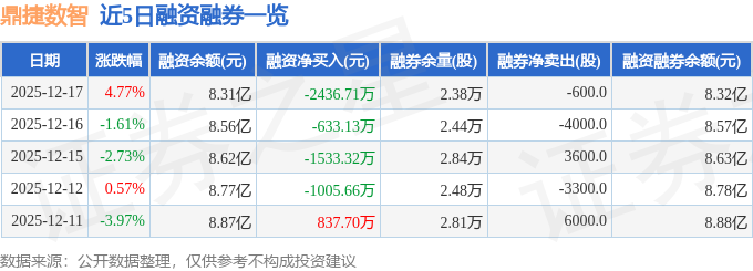 鼎捷数智融资融券信息显示,融资方面,当日融资买入3965.96万元,融资偿还6402.68万元,融资净偿还2436.71万元。融券方面,融券卖出2800.0股,融券偿还3400.0股,融券余量2.38万股,融券余额100.44万元。融资融券余额8.32亿元。