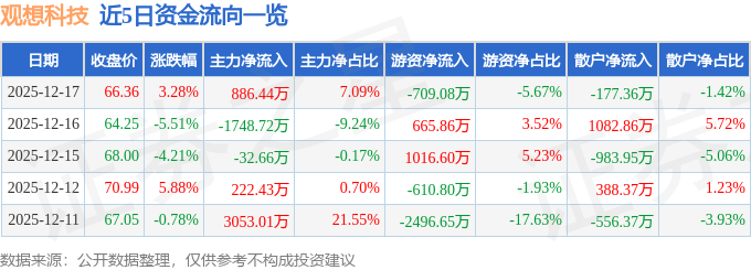 证券之星消息,截至2025年12月17日收盘,观想科技(301213)报收于66.36元,上涨3.28%,换手率3.7%,成交量1.91万手,成交额1.25亿元。