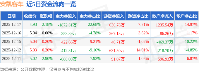 证券之星消息,截至2025年12月17日收盘,安凯客车(000868)报收于4.93元,下跌2.18%,换手率2.29%,成交量16.76万手,成交额8254.38万元。