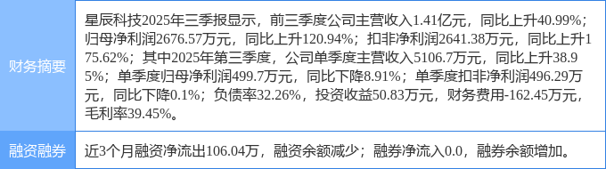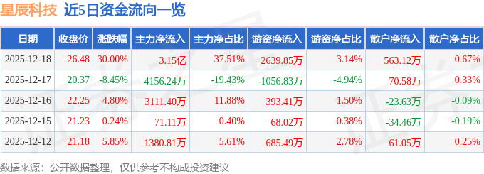证券之星消息,星辰科技12月18日涨停收盘,收盘价26.48元。该股于11点8分涨停,5次打开涨停,截止收盘封单资金为1356.52万元,占其流通市值0.59%。