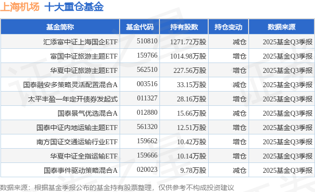 重仓上海机场的前十大公募基金请见下表: