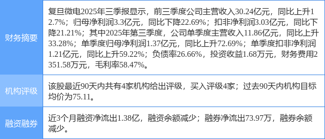 2025年11月10日,太平洋研究员张世杰,李珏晗发布了对复旦微电的研报《Q3业绩大幅提升,FPGA业务持续成长》,该研报对复旦微电给出“买入”评级。研报中预计2025-2027年营业总收入分别为41.19、48.90、58.01亿元,同比增速分别为14.73%、18.72%、18.61%;归母净利润分别为6.41、10.08、13.74亿元,同比增速分别为11.98%、57.26%、36.23%,对应25-27年PE分别为74X、47X、35X,维持“买入”评级。证券之星数据中心根据近三年发布的研报数据计算,该研报作者对此股的盈利预测准确度为18.9%。