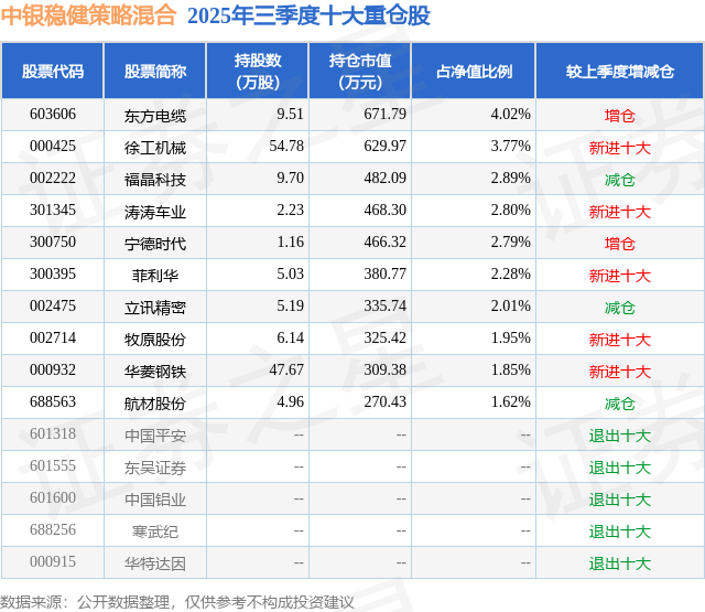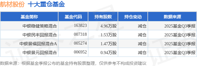 根据2025基金Q3季报公募基金重仓股数据,重仓该股的公募基金共4家,其中持有数量最多的公募基金为中银基金的中银稳健策略混合。中银稳健策略混合目前规模为1.67亿元,最新净值1.7922(12月17日),较上一交易日上涨1.41%,近一年上涨21.13%。该公募基金现任基金经理为涂海强。涂海强在任的基金产品包括:中银景福回报混合A,管理时间为2018年4月17日至今,期间收益率为62.21%;中银景元回报混合,管理时间为2019年3月26日至今,期间收益率为48.17%;中银民丰回报混合,管理时间为2019年7月31日至今,期间收益率为28.34%;