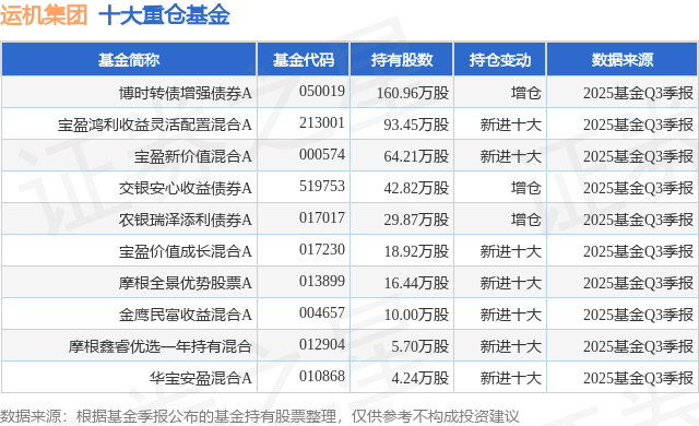 根据2025基金Q3季报公募基金重仓股数据,重仓该股的公募基金共10家,其中持有数量最多的公募基金为博时基金的博时转债增强债券A。博时转债增强债券A目前规模为12.13亿元,最新净值2.2411(12月17日),较上一交易日上涨1.72%,近一年上涨29.2%。该公募基金现任基金经理为过钧 高晖。过钧在任的基金产品包括:博时信用债券A/B,管理时间为2009年6月10日至今,期间收益率为300.25%;博时新收益A,管理时间为2016年2月29日至今,期间收益率为205.78%;博时双季鑫6个月持有混合A,管理时间为2021年1月20日至今,期间收益率为11.01%;博时浦惠一年持有期混合A,管理时间为2022年2月17日至今,期间收益率为16.79%。高晖在任的基金产品包括:博时稳健回报债券(LOF)C,管理时间为2023年10月20日至今,期间收益率为10.02%;博时可转债ETF,管理时间为2023年10月20日至今,期间收益率为21.64%。