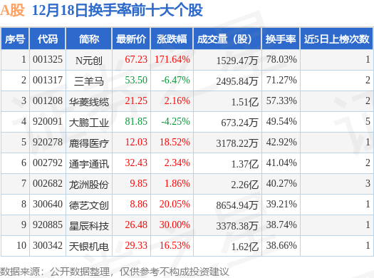 当日A股换手率前10大个股中8只个股收涨,平均涨幅32.89%,其中N元创(001325)以换手率78.03%排第一,5只个股近5个交易日中多次上榜。