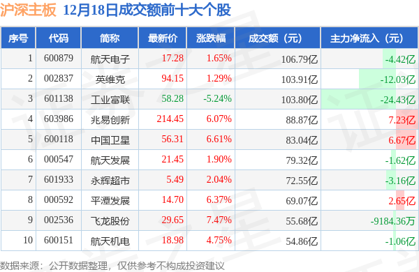 当日沪深主板成交额前10大个股中9只个股收涨,平均涨幅4.24%,其中航天电子(600879)以成交额106.79亿元排第一。从主力资金流入看,成交额前10大个股中有3只个股呈现主力资金净流入。