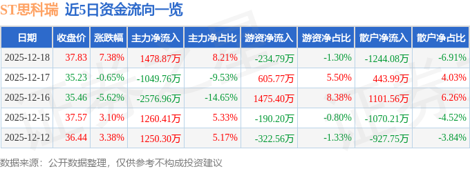 证券之星消息,截至2025年12月18日收盘,ST思科瑞(688053)报收于37.83元,上涨7.38%,换手率4.86%,成交量4.86万手,成交额1.8亿元。