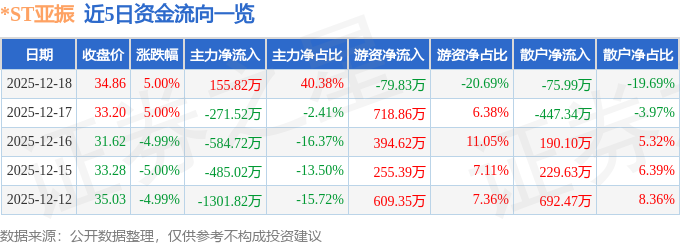 证券之星消息,截至2025年12月18日收盘,*ST亚振(603389)报收于34.86元,上涨5.0%,换手率0.04%,成交量1107.0手,成交额385.9万元。