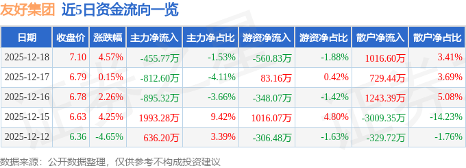 证券之星消息,截至2025年12月18日收盘,友好集团(600778)报收于7.1元,上涨4.57%,换手率13.55%,成交量42.17万手,成交额2.98亿元。