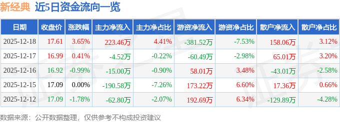 证券之星消息,截至2025年12月18日收盘,新经典(603096)报收于17.61元,上涨3.65%,换手率1.86%,成交量2.87万手,成交额5067.36万元。
