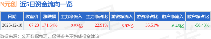 证券之星消息,截至2025年12月18日收盘,N元创(001325)报收于67.23元,上涨171.64%,换手率78.03%,成交量15.29万手,成交额11.05亿元。