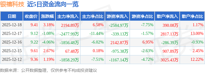 证券之星消息,截至2025年12月18日收盘,银禧科技(300221)报收于9.41元,上涨3.18%,换手率7.77%,成交量35.49万手,成交额3.34亿元。