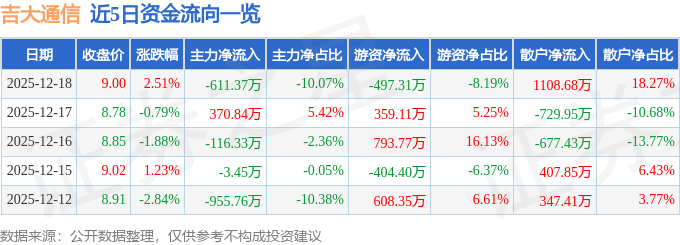 证券之星消息,截至2025年12月18日收盘,吉大通信(300597)报收于9.0元,上涨2.51%,换手率2.49%,成交量6.77万手,成交额6069.22万元。