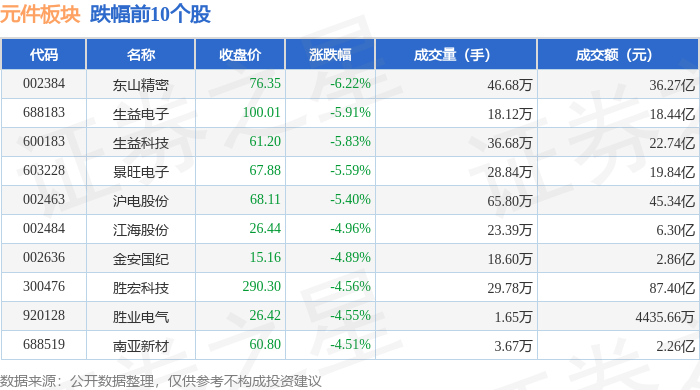 证券之星消息,12月18日元件板块较上一交易日下跌4.06%,东山精密领跌。当日上证指数报收于3876.37,上涨0.16%。深证成指报收于13053.98,下跌1.29%。元件板块个股涨跌见下表: