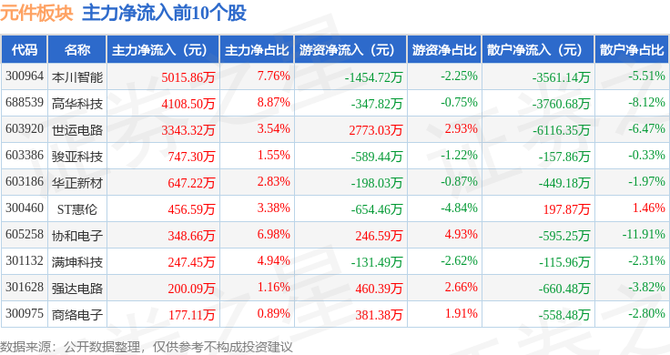 从资金流向上来看,当日元件板块主力资金净流出34.54亿元,游资资金净流入11.61亿元,散户资金净流入22.93亿元。元件板块个股资金流向见下表: