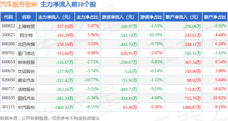 从资金流向上来看,当日汽车服务板块主力资金净流出3087.32万元,游资资金净流出2274.34万元,散户资金净流入5361.65万元。汽车服务板块个股资金流向见下表: