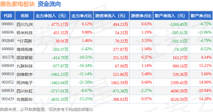 从资金流向上来看,当日黑色家电板块主力资金净流出9413.41万元,游资资金净流入2135.9万元,散户资金净流入7277.51万元。黑色家电板块个股资金流向见下表: