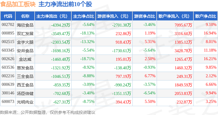 从资金流向上来看,当日食品加工板块主力资金净流出2.1亿元,游资资金净流出4398.24万元,散户资金净流入2.54亿元。食品加工板块个股资金流向见下表: