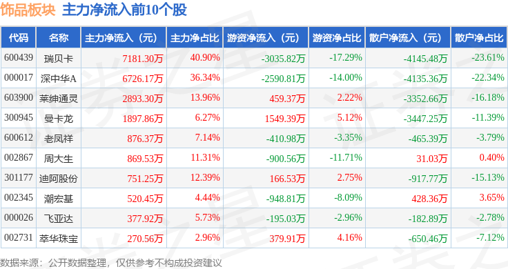 从资金流向上来看,当日饰品板块主力资金净流入1.84亿元,游资资金净流出5316.61万元,散户资金净流出1.31亿元。饰品板块个股资金流向见下表: