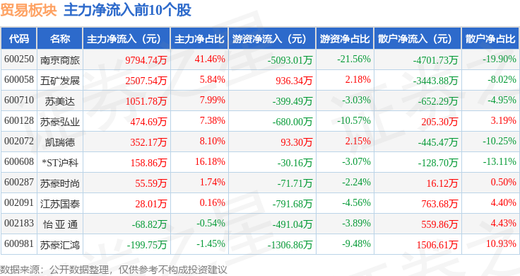 从资金流向上来看,当日贸易板块主力资金净流入1.18亿元,游资资金净流出7477.3万元,散户资金净流出4340.57万元。贸易板块个股资金流向见下表:
