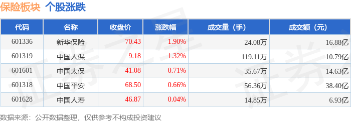 证券之星消息,12月18日保险板块较上一交易日上涨0.58%,新华保险领涨。当日上证指数报收于3876.37,上涨0.16%。深证成指报收于13053.98,下跌1.29%。保险板块个股涨跌见下表: