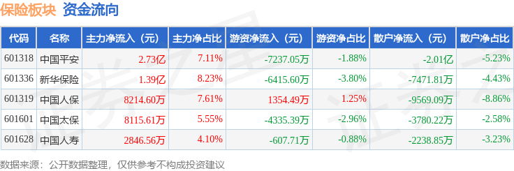 从资金流向上来看,当日保险板块主力资金净流入6.04亿元,游资资金净流出1.72亿元,散户资金净流出4.31亿元。保险板块个股资金流向见下表: