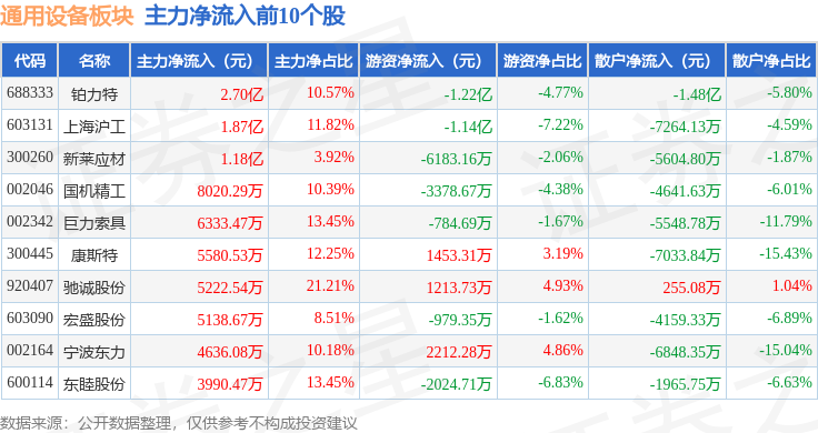 从资金流向上来看,当日通用设备板块主力资金净流出3.24亿元,游资资金净流出5.2亿元,散户资金净流入8.43亿元。通用设备板块个股资金流向见下表:
