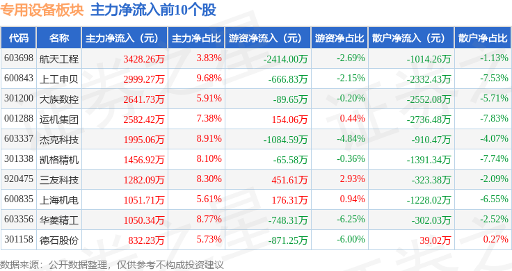 从资金流向上来看,当日专用设备板块主力资金净流出30.22亿元,游资资金净流入5.86亿元,散户资金净流入24.36亿元。专用设备板块个股资金流向见下表:
