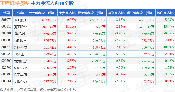 从资金流向上来看,当日工程机械板块主力资金净流出6654.89万元,游资资金净流出2553.45万元,散户资金净流入9208.33万元。工程机械板块个股资金流向见下表: