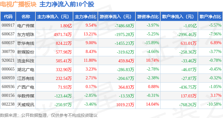 从资金流向上来看,当日电视广播板块主力资金净流入1.99亿元,游资资金净流出1.26亿元,散户资金净流出7291.31万元。电视广播板块个股资金流向见下表:
